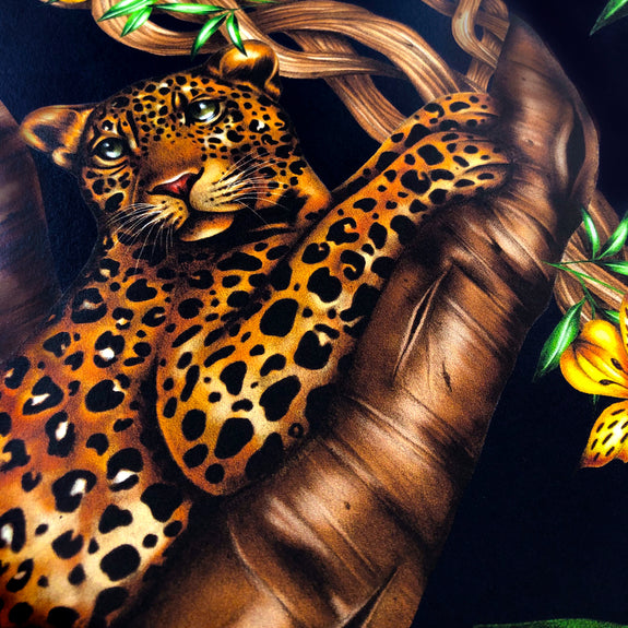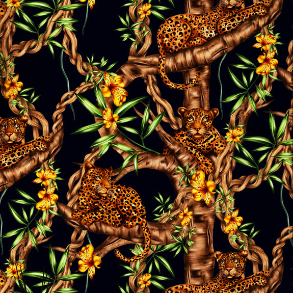 Bring your interiors to life with luxury Charlotte Jade Wallpaper. Step into the wild! Inspired by the African Leopard, our Jungle Life pattern features these magnificent creatures lounging in a tropical paradise. The sunset yellow Alstroemeria flowers introduce pops of colour, contrasted by the green foliage, twisted woody vines and deep midnight blue background. This pattern creates a stunning centrepiece and brings a luxurious feel to your interiors. Our luxury wallpaper comes from FSC registered suppliers, and is printed with HP Latex eco-friendly water-based inks on a non-woven substrate.