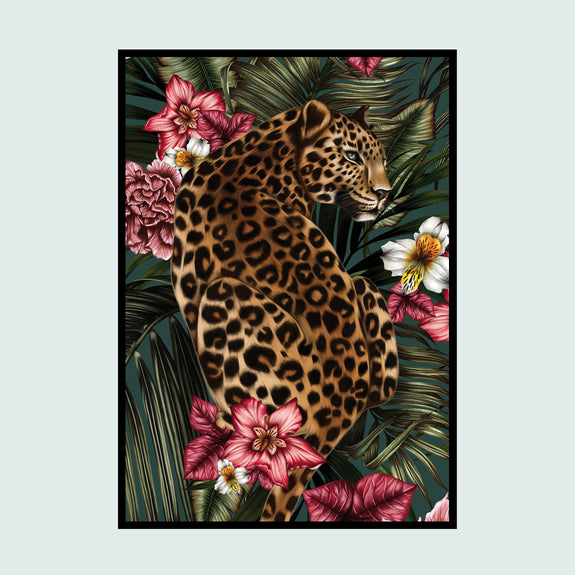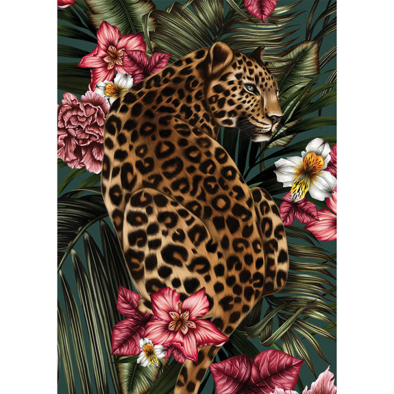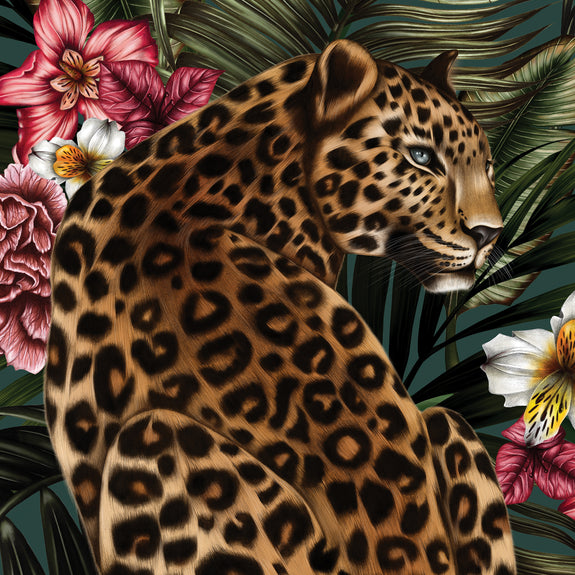Be dazzled by our Panthera Paradise pattern which celebrates the stunning beauty of the Asian Leopard. Featuring beautiful botanicals and flourishing foliage paired with a deep teal green background, this dreamy, nostalgic pattern will take you back to that place you call paradise!