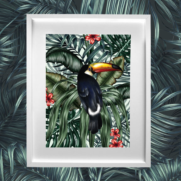 Inspired by the South American Jungle, our Toucan art print combines wild, lush green foliage with a beautiful exotic Toucan. These gorgeous birds are vibrant and unique and will certainly bring some life to your walls! Shop our full Tropical Collection.