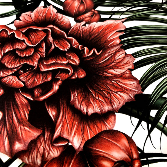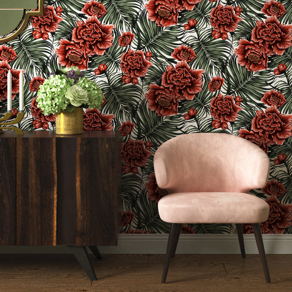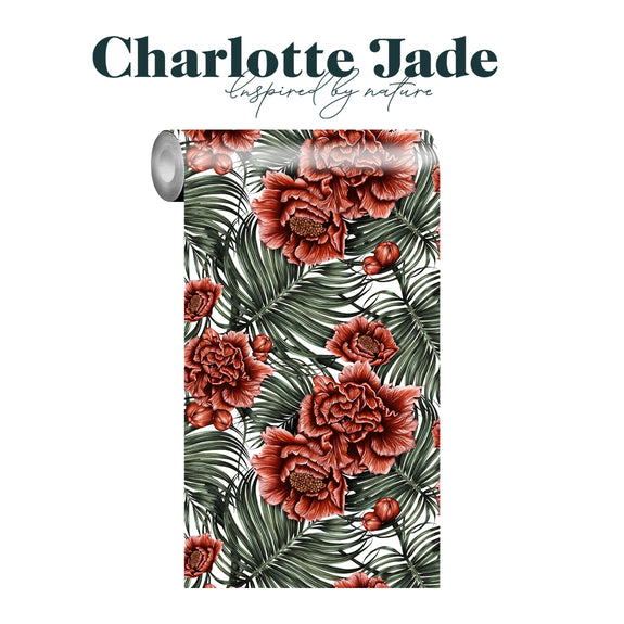 Bring your interiors to life with luxury Charlotte Jade Wallpaper. Blooming from the pomegranate tree, this beautiful flower is native to the tropical Balearic Islands and will bring an exotic feel to your interiors. The red and orange tones are ideal for an impactful feature wall, and combined with lush green palms, this design is perfect to bring the summer sunshine indoors all year round! Our luxury wallpaper comes from FSC registered suppliers, and is printed with HP Latex eco-friendly water-based inks on a non-woven substrate.